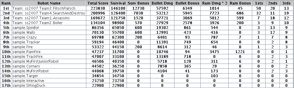 Die folgenden Ergebnisse wurden beim Wettkampf aller Teams gegeneinander in jeweils 100 Runden, mit und ohne Einbeziehen der "Sample"-Roboter, erzielt (Spielfeldgröße 1000x1000 Pixel, ansonsten Robocode-Defaulteinstellungen):
